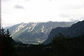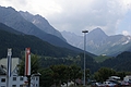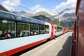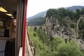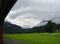 We hebben om 11:42 de trein naar Landquart genomen, door de Vereintunnel. Toen we de tunnel uit kwam regende het en het duurde niet lang meer of het hoosde en weg uitzicht. Om 13:10 waren we in Landquart, gelukkig was de stationsrestauratie te bereiken zonder helemaal nat te worden. Om 13:34 hadden we de trein naar Chur, een dubbeldekker (Bassel-Zürich), daar hebben we de regional express naar Filisur genomen. Hoe dichter we bij Filisur kwamen, hoe droger het werd. Gelukkig.